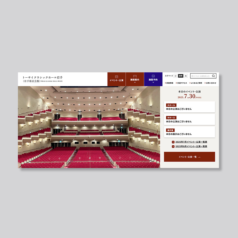 トップページには「本日のイベント・公演」エリアを新設し、アクセス直後に当日の催し情報を確認できる構成としました。