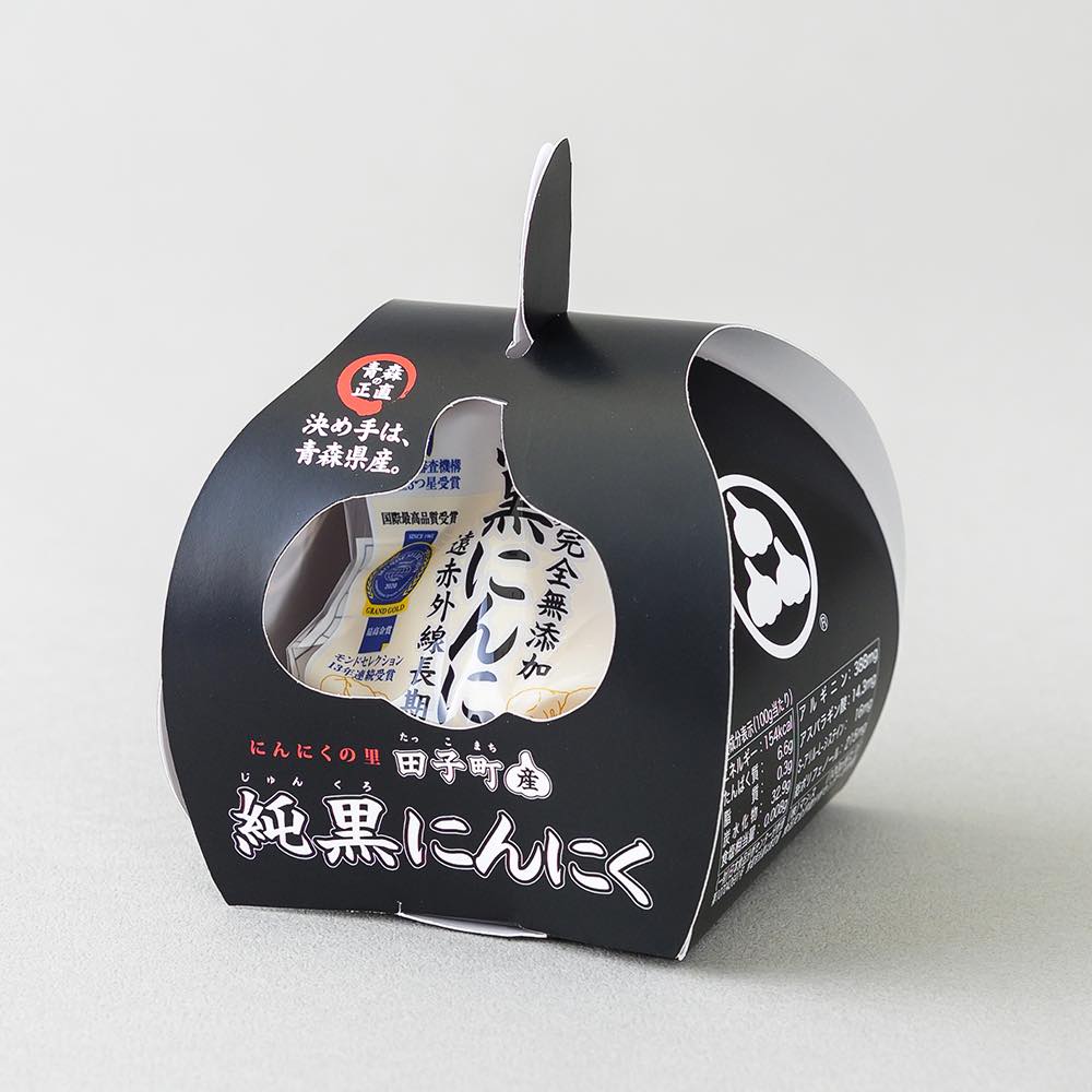 「純黒にんにく」のパッケージ製作においては、発送時に商品を保護するよう、適切なサイズに調整。品質と栄養価の高さを、食品表示法に則って消費者に分かりやすく、正しく訴求するデザインで仕上げました。
