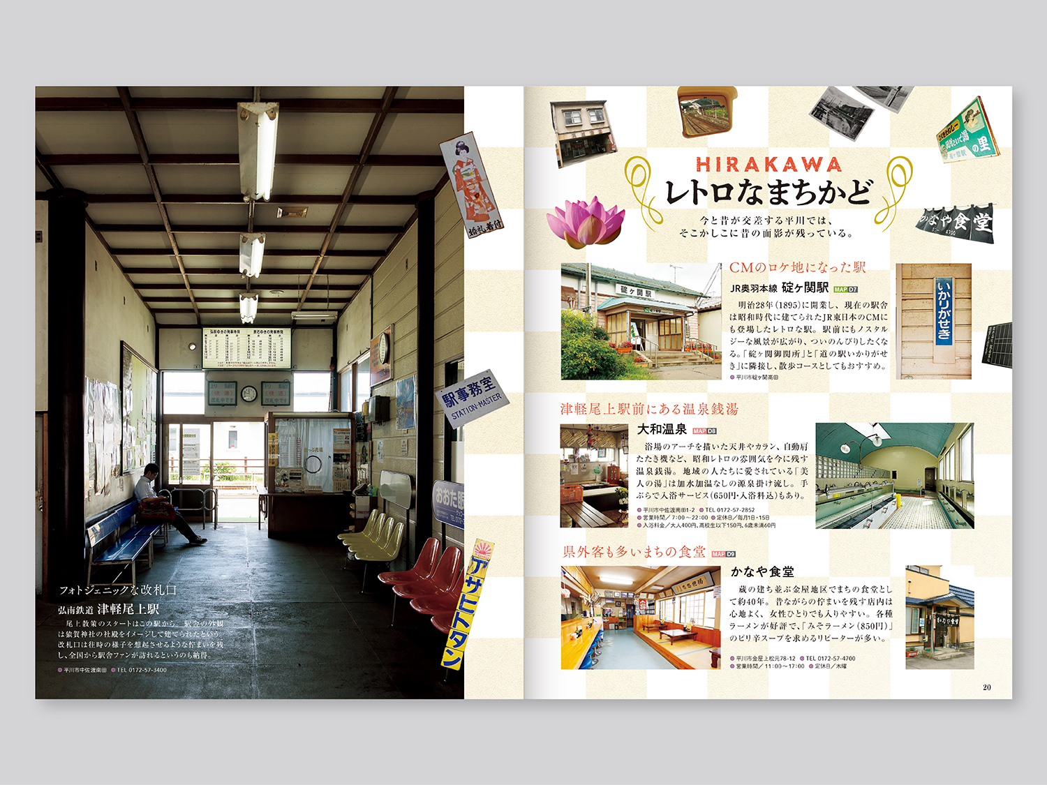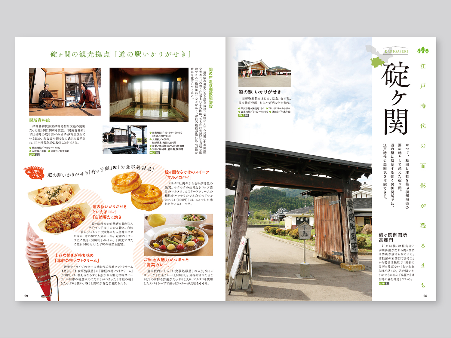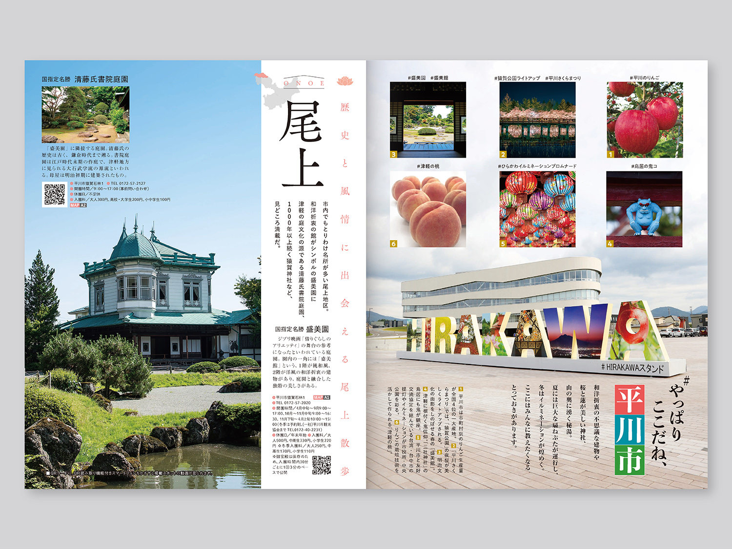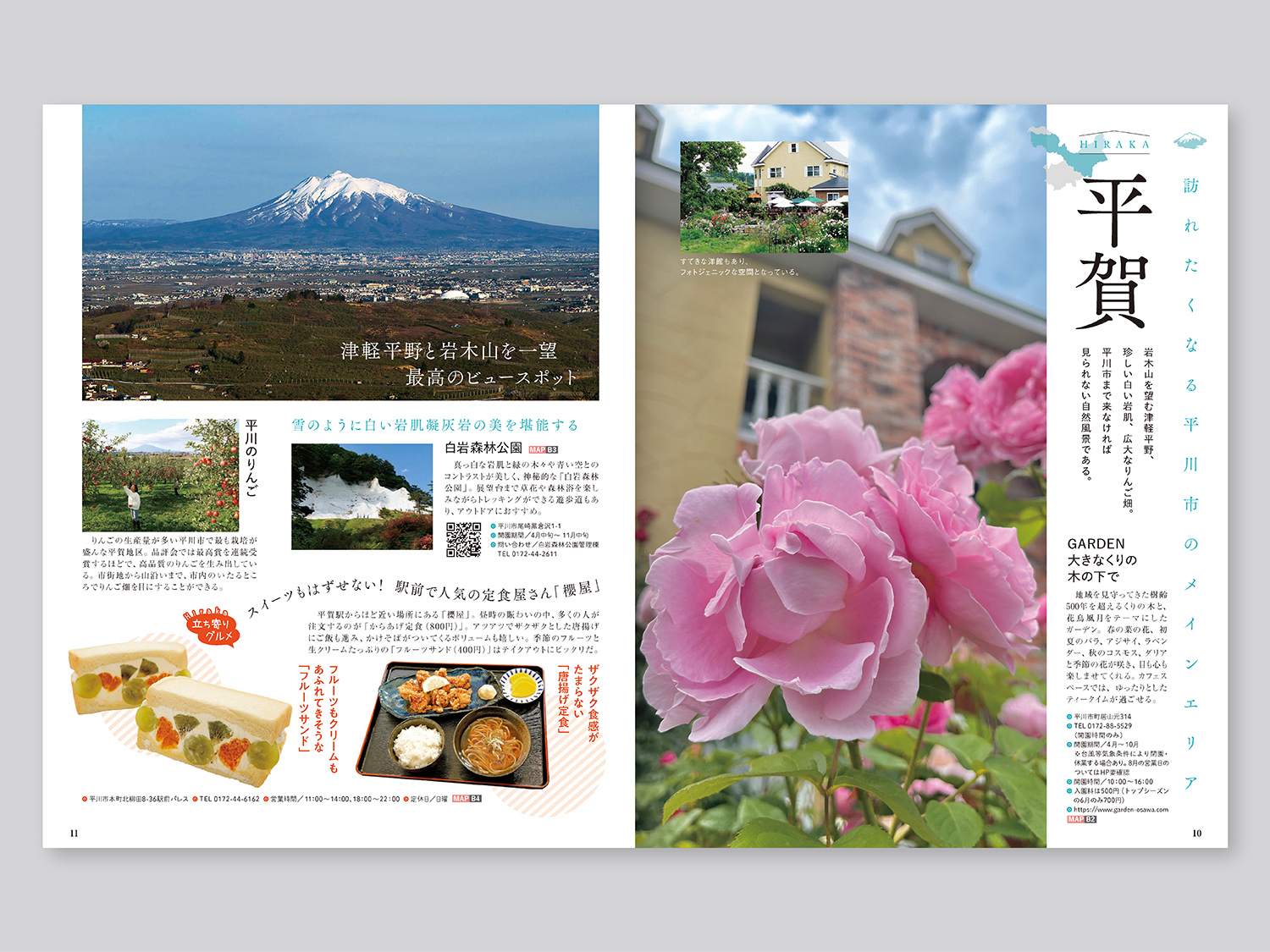 巻頭ページでは、同市を構成する3地域(平賀、尾上、碇ヶ関)の見どころを紹介。初めて訪れた人でもまち歩きを楽しめるよう、ひと休みできる寄り道スポットや、ご当地グルメが味わえるお店の情報を充実させています。
