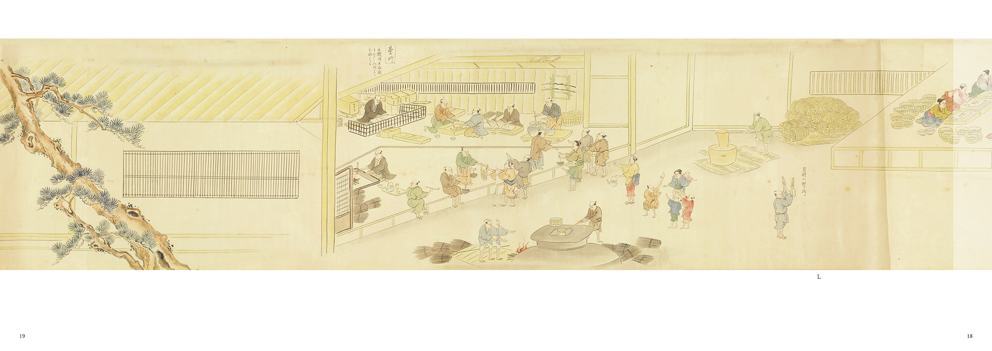 図録は、12mに及ぶ絵巻が途切れないよう見開きを連続して展開し、一冊にまとめました。長大な絵柄の魅力をすみずみまで楽しめるように作成しています。